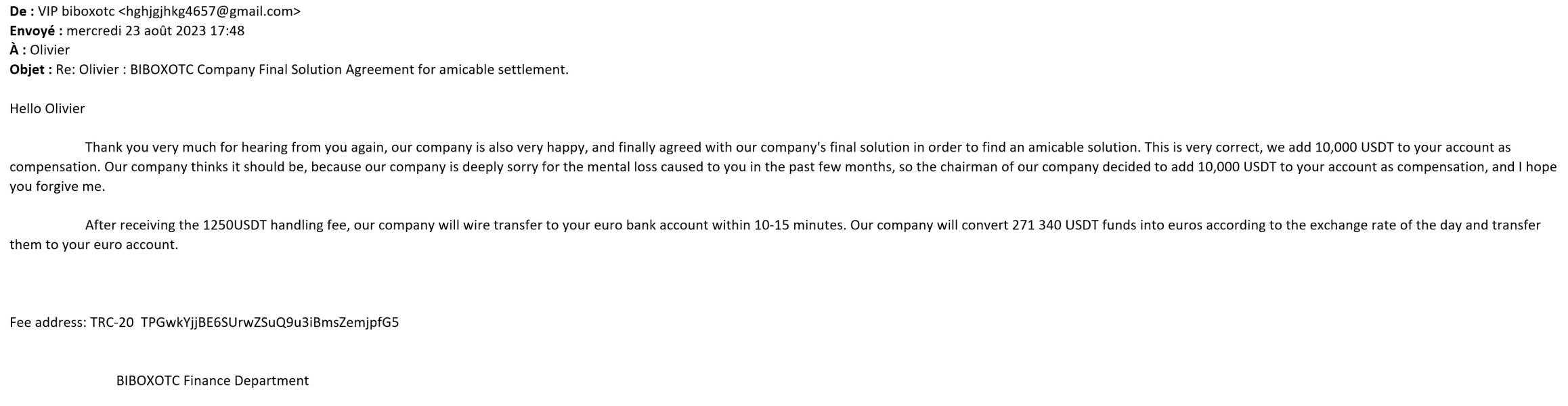 Jane MILKA , 37 yo french & American Trader associated with BIBOXOTC VIP Online Customer Service (@ hghjgjhkg4657@gmail.com) (https://www.biboxotc.com), MENACED ME TO DELETE ALL MY IT TRANSACTIONS RECORDS (PRINCIPAL WIRE TRANSFERS + TRADING PROFITS DATA), IN ORDER TO MAKE IMPOSSIBLE MY 271,34 KUSDT ASSETS RECOVERY (SEE SCREENSHOTS). I URGENTLY NEED YOUR EXPERTISE FOR INVESTIGATION WITH AUTHORITIES to force them paying my hardly-earned money.