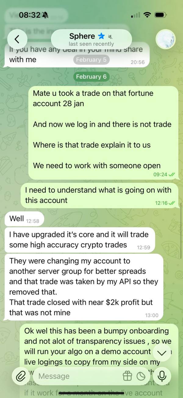 Broker Name Fortune Prime Global Ltd Account Number 87**** Platform MetaTrader (Live account, API / copy-trading environment) Complaint Details I am submitting this report to raise serious concerns regarding trade integrity, broker transparency, and client protection involving Fortune Prime Global Ltd. I participated in a copy-trading arrangement using what was represented as a live Fortune Prime Global trading account. I paid approximately USD 1,500 to access this setup. Missing Live Trade – 28 January On 28 January, a trade was: • Executed on the live account • Clearly visible on the trading platform • Personally observed by me Later the same day, the trade: • Disappeared entirely from the account history • Had no broker-generated adjustment record • Had no explanation visible on the platform When questioned, I was told the broker was: • “Changing the account to another server group for better spreads” • That the trade was “t