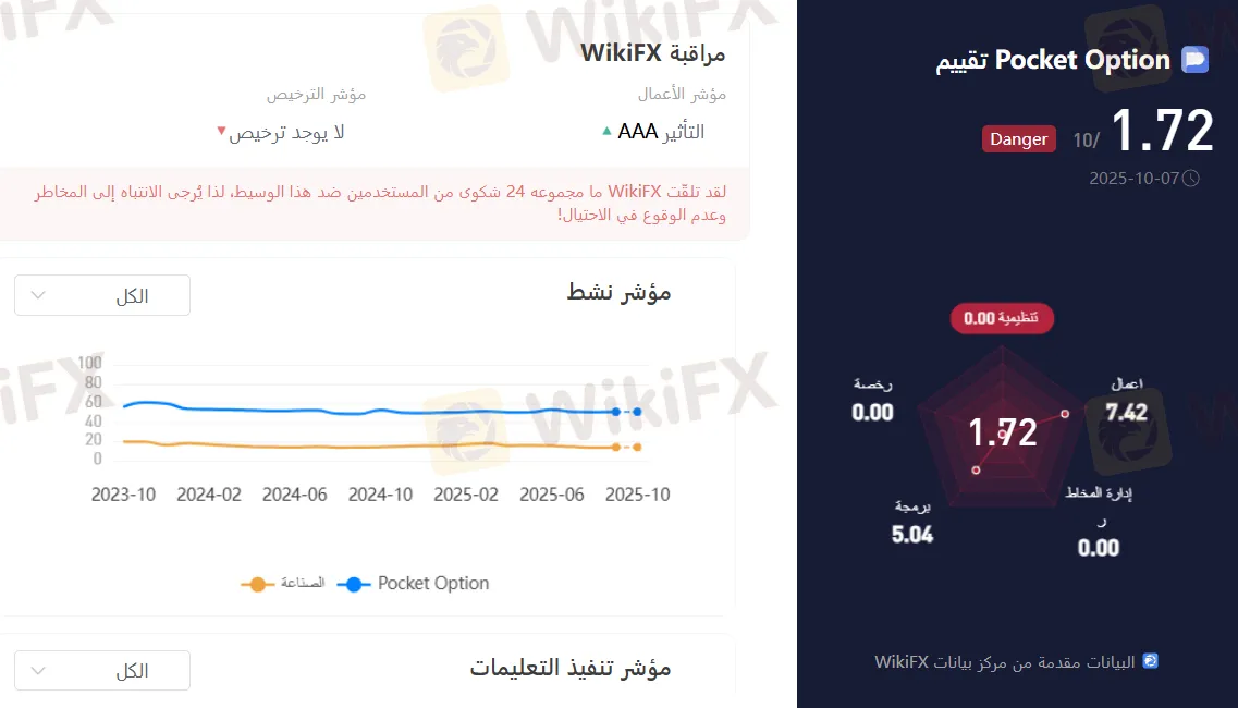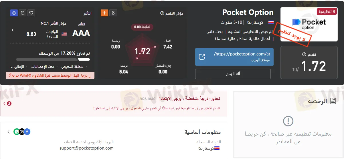 حصلت شركة Pocket Option على تقييم منخفض جدًا في WikiFX بسبب غياب الترخيص وتعدد شكاوى العملاء.