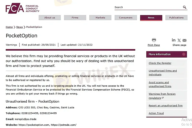 - 2022-11-20 تصدر هيئة الرقابة المالية (FCA) تحذيرًا ضد Pocket Option :
