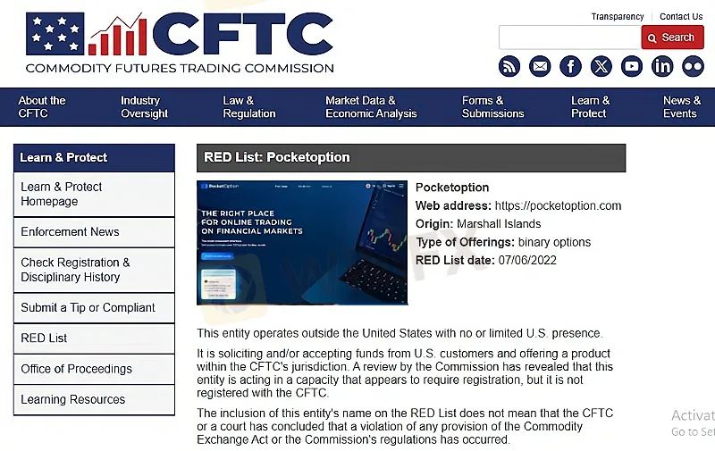 - 06-06-2022 تصدر هيئة تداول السلع الآجلة (CFTC) تحذيرًا ضد Pocket Option :