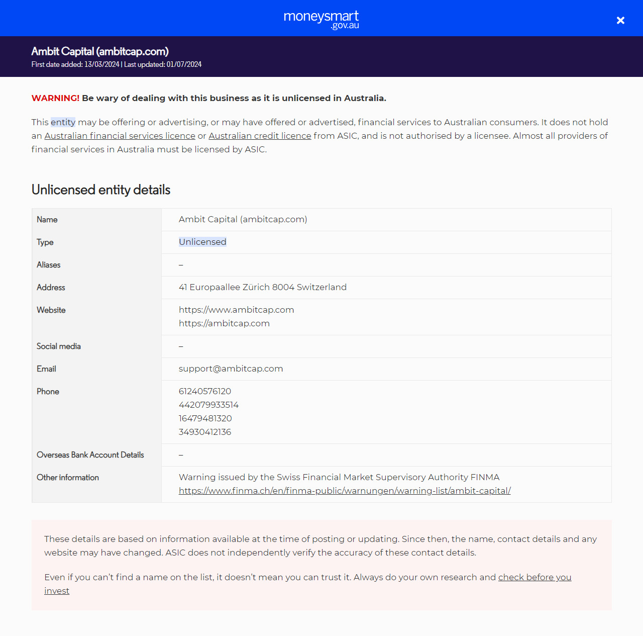 معلومات أخرىتحذير صادر عن هيئة الرقابة المالية السويسرية FINMA https://www.finma.ch/en/finma-public/warnungen/warning-list/ambit-capital/.