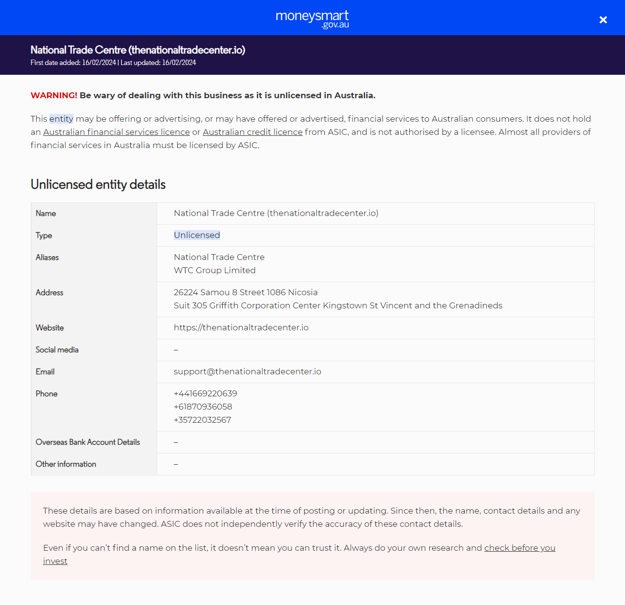 النوعغير مرخصتقديم خدمات مالية (بما في ذلك المنتجات المالية) للأشخاص في أستراليا بدون ترخيص. لا يحملون ترخيص خدمات مالية أسترالية (AFS) أو ترخيص ائتمان أسترالي من ASIC.