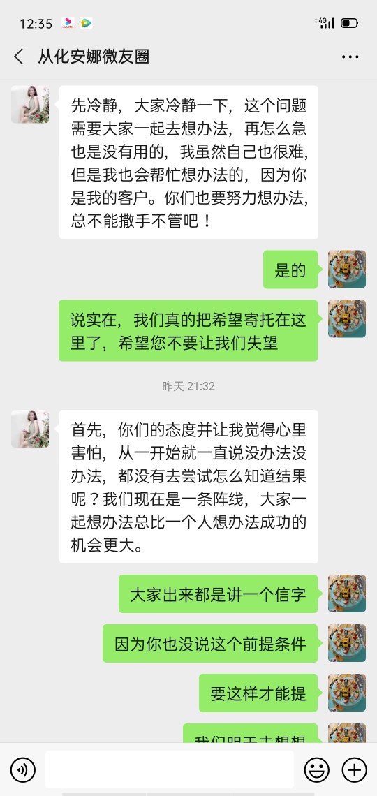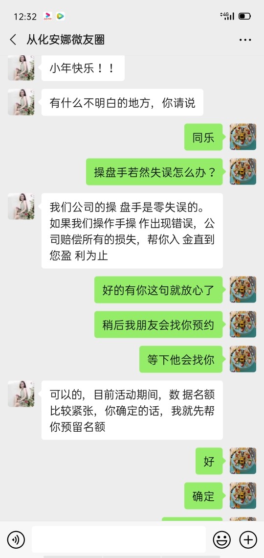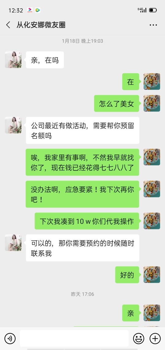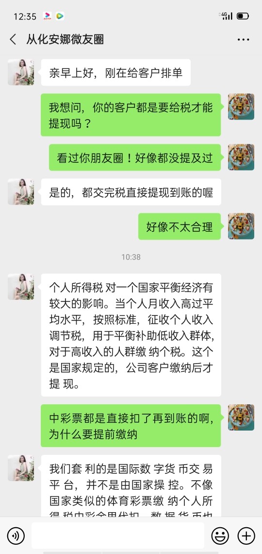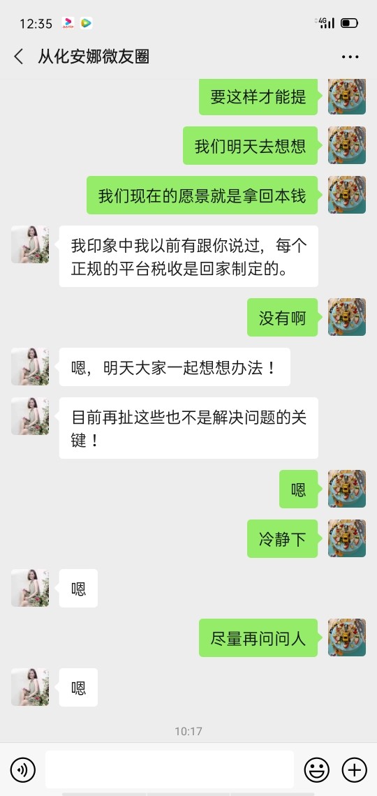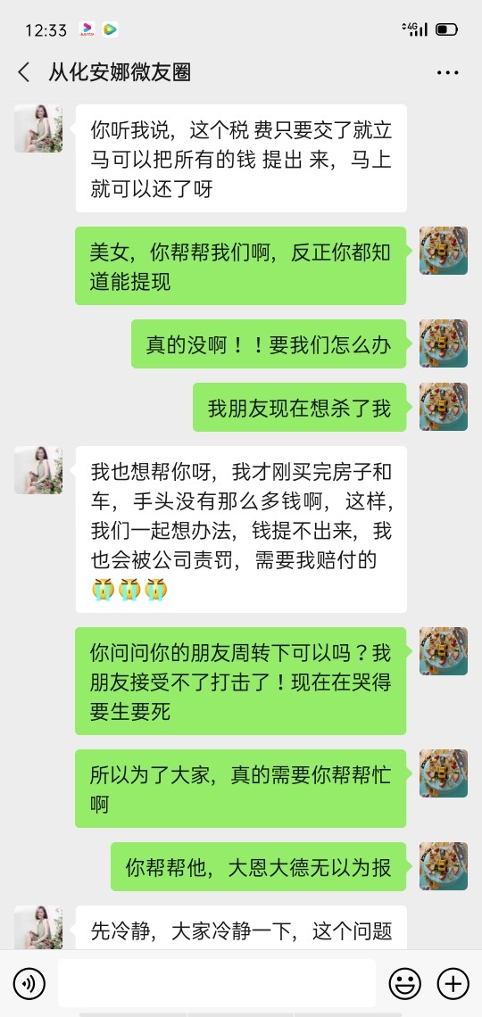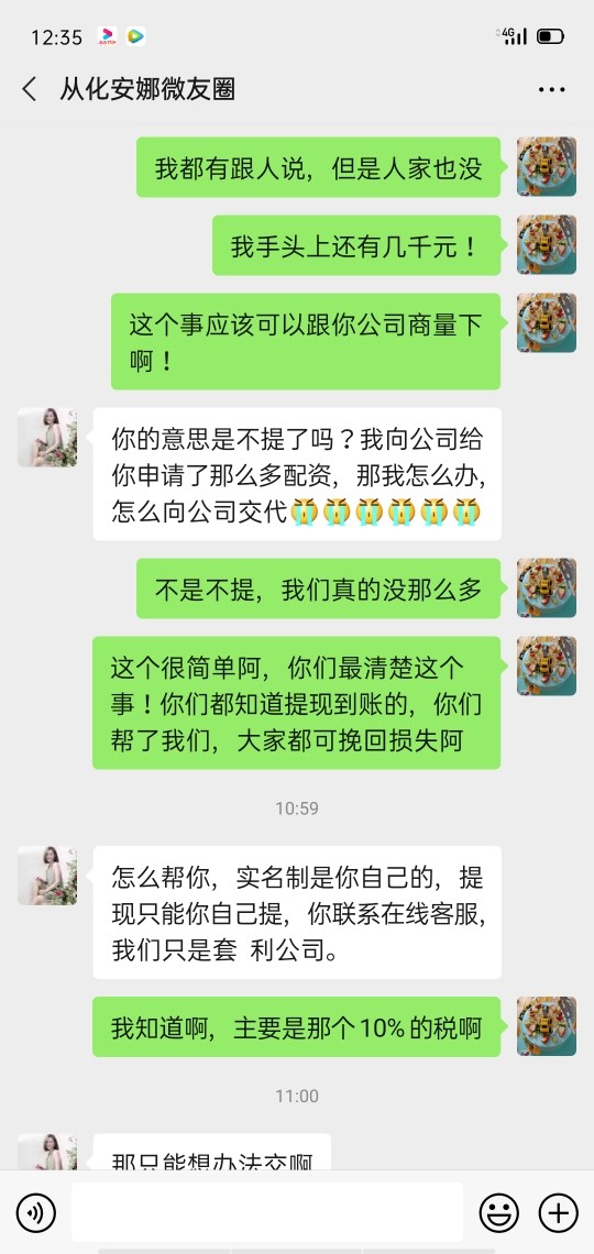 此人是骗子,天天发朋友圈,又说公司有活动,投资10万配资十万,预约操盘手,操作完又说要交个人所得税!!还我血汗钱
