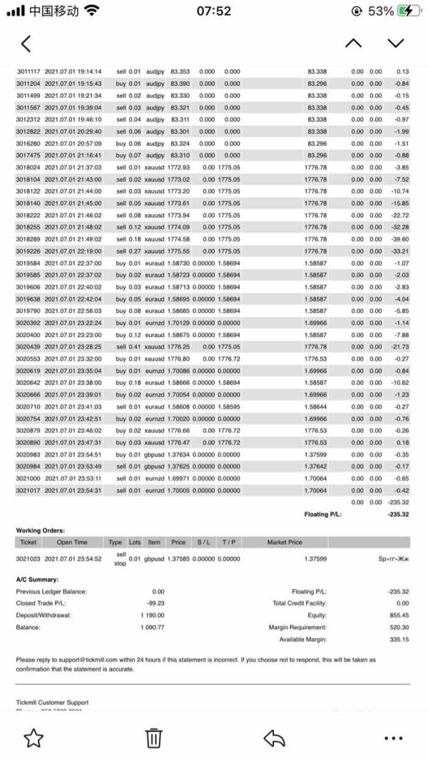 账户资金被转移到新开的账户疯狂交易,亏剩下很少了,密码又被改了后台进不去也无法制止,发送修改密码连接几次都收不到邮件,客服一直全员忙,留言了几次说明问题也没有回复,只回复了账户资金没有出金。而要修改密码必须进邮箱,邮箱只有自己能进,只能是tickmill内部出问题了。妥妥的黑平台,估计是要刷爆我的佣金。枉我那么信任tickmill,付上一张资金转移到的新账户的交易记录。可能我是第一个遇到这种情况的,希望其他人有类似的勇于曝光