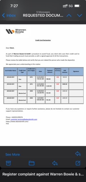 Respected sir, I am Jeevan Roy Chalippattu Roy from India am working in Abudhabi. I opened a trading account in WARREN BOWIE & SMITH application and they call me and compelled me to deposit money for trading and I deposited 7500 USD and started trading also then 1st trading was over and they asked me to request for withdrawal amount of 200 USD and I applied withdrawal they approved and I received the money back to my account. After that I made another trading and one that trading was over I applied for another withdrawal of 500 USD but they declined after that I traded again then that also was got profit and I made withdrawal requests they canceled my withdrawal requests. They maid trade from my account without my permission and they asked me to deposit more money again and again. One staff MR.Ishwar is calling me continuously for depositing money for trading. They scammed my all money and they are not giving me anything back. I used my credit card for depositing money while depositing money Mr. Ishwar said that he will pay back all money before 20th December 2023. Please help me to get back my money back. Kindly help me with this issue please and take action against this scam broker. Regards Jeevan Roy
