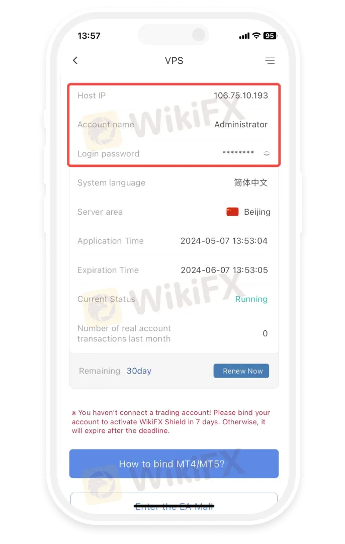 Öffnen Sie die WikiFX-App, gehen Sie zu [Mein] – [Mein VPS], um Ihre Host-IP, Ihren Benutzernamen und Ihr Passwort zu erhalten.