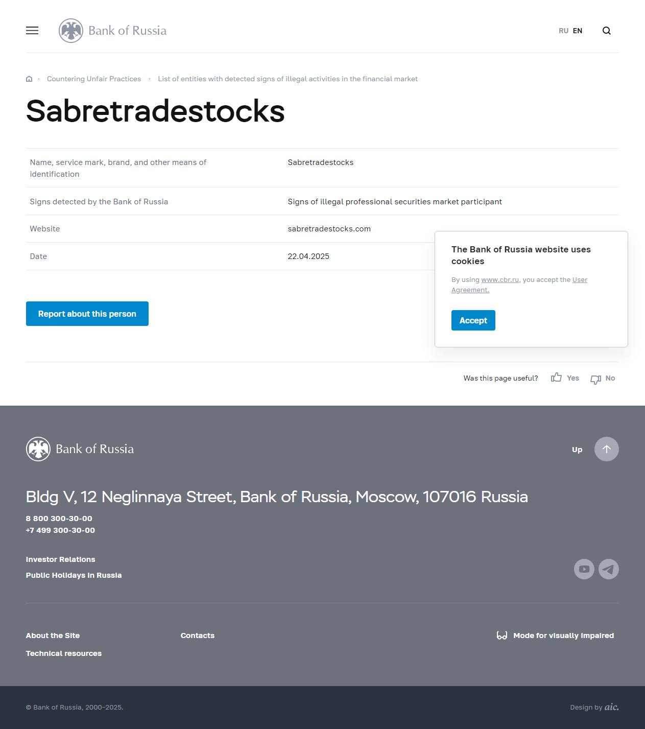 Liste der Unternehmen mit festgestellten Anzeichen illegaler Aktivitäten auf dem Finanzmarkt Sabretradestocks.