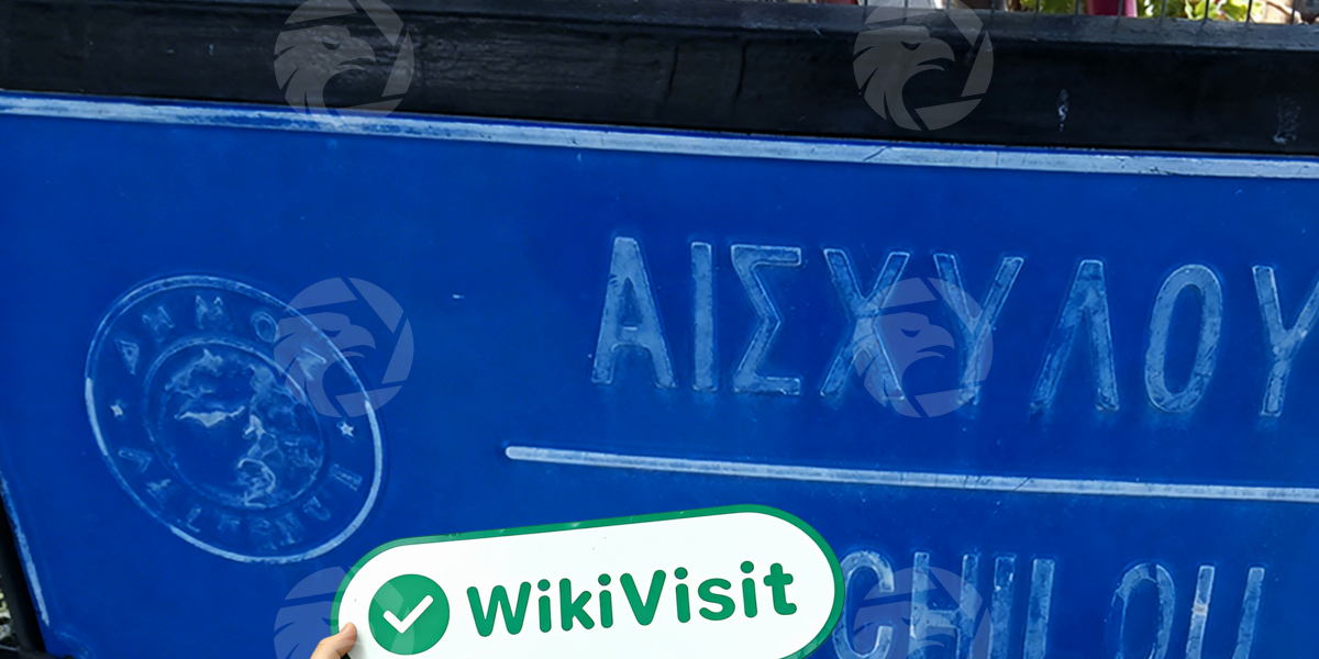 Der Vermesser kam in die Aischylou-Straße und sah ein blaues Schild. Das endgültige Ziel des Vermessers war die Straße hinunter.