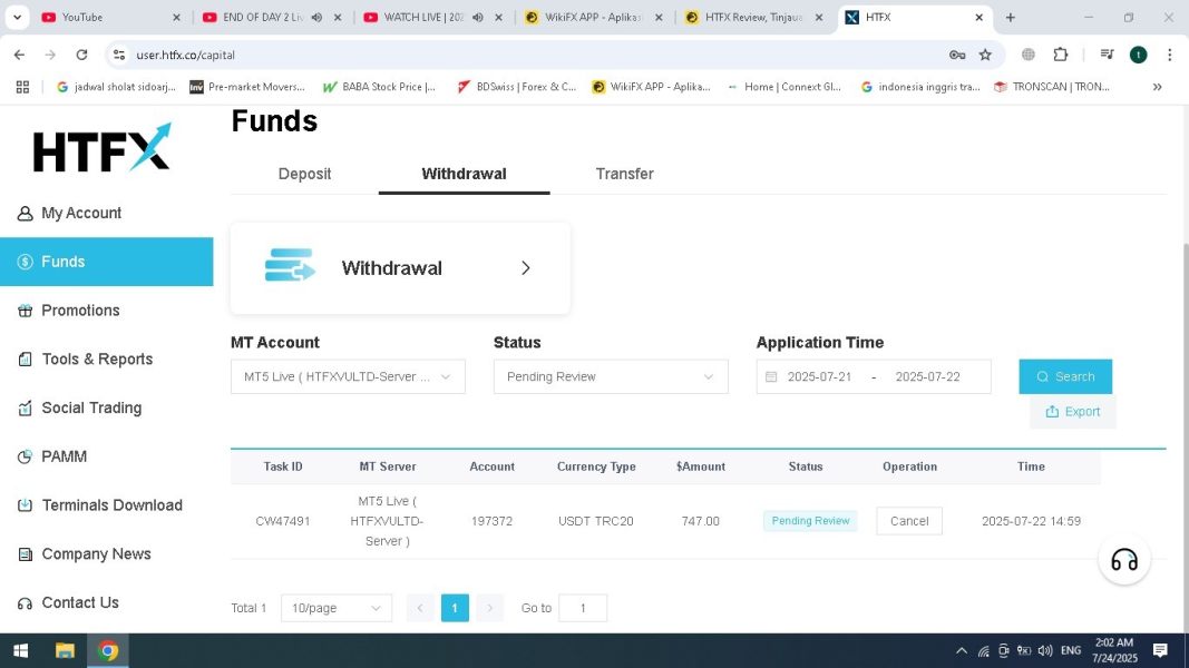 Requesting a withdrawal on the HTFX platform, but the funds have not been received.
