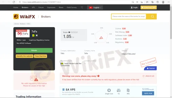 7XFX is an online operating brokerage firm that provides traders with online trade services. This broker is claimed to be regulated by the Financial Services Authority of Saint Vincent and the Grenadines (SVGFSA).However, according to WikiFX, we have known that this broker‘s registered region is Saint Vincent and the Grenadines, but the company address remains unknown. The SVGFSA actually doesn’t license brokers registered on the island, meaning that this broker is unregulated. It is risky to invest with them as WikiFX gives 7XFX a very low rating of 1.05/10.