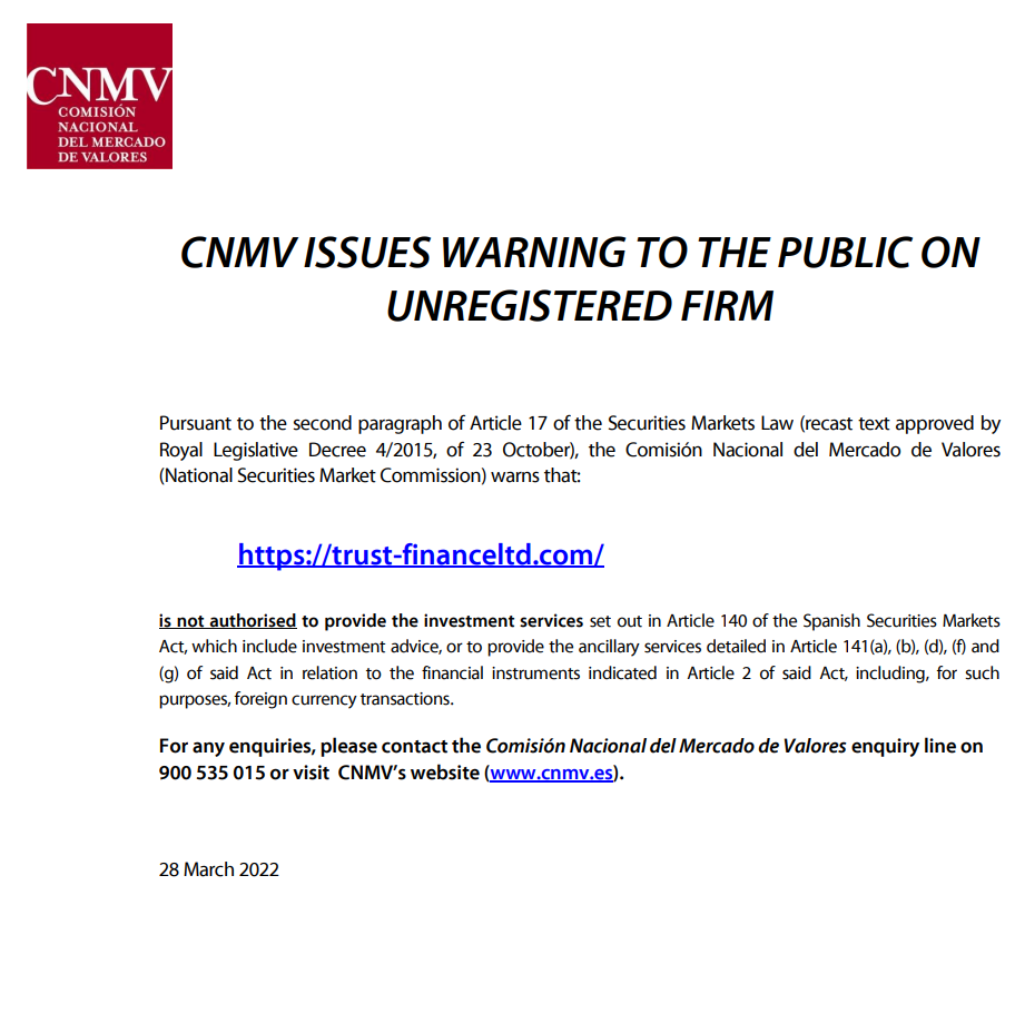 Pursuant to the second paragraph of Article 17 of the Securities Markets Law (recast text approved by Royal Legislative Decree 4/2015, of 23 October), the Comisión Nacional del Mercado de Valores (National Securities Market Commission) warns that:https://trust-financeltd.com/ is not authorised to provide the investment services set out in Article 140 of the Spanish Securities Markets Act, which include investment advice, or to provide the ancillary services detailed in Article 141(a), (b), (d), (f) and (g) of said Act in relation to the financial instruments indicated in Article 2 of said Act, including, for such purposes, foreign currency transactions.