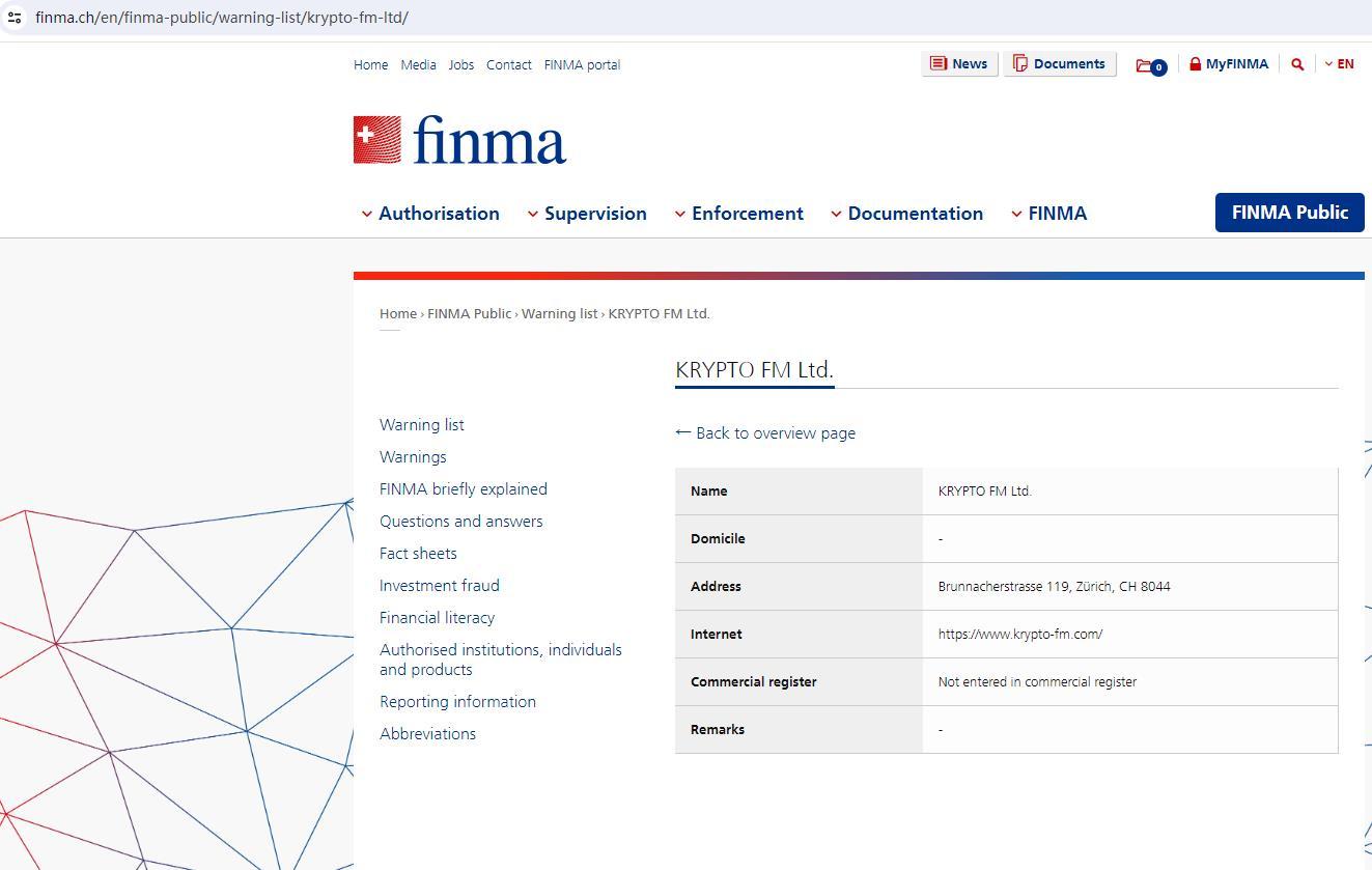 Warning list of unauthorised companies and individuals Warning List - https://www.krypto-fm.com