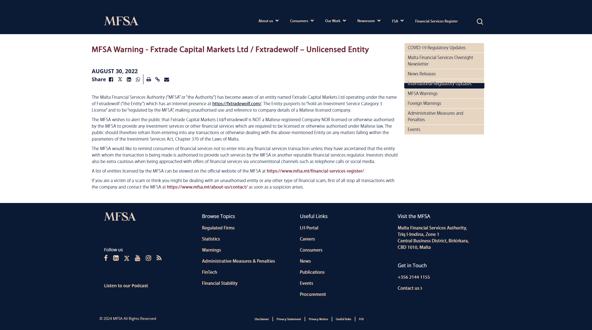 - Reason for punishmentThe MFSA wishes to alert the public that Fxtrade Capital Markets Ltd/Fxtradewolf is NOT a Maltese registered Company NOR licensed or otherwise authorised by the MFSA to provide any investment services or other financial services which are required to be licensed or otherwise authorised under Maltese law. The public should therefore refrain from entering into any transactions or otherwise dealing with the above-mentioned Entity on any matters falling within the parameters of the Investment Services Act, Chapter 370 of the Laws of Malta.