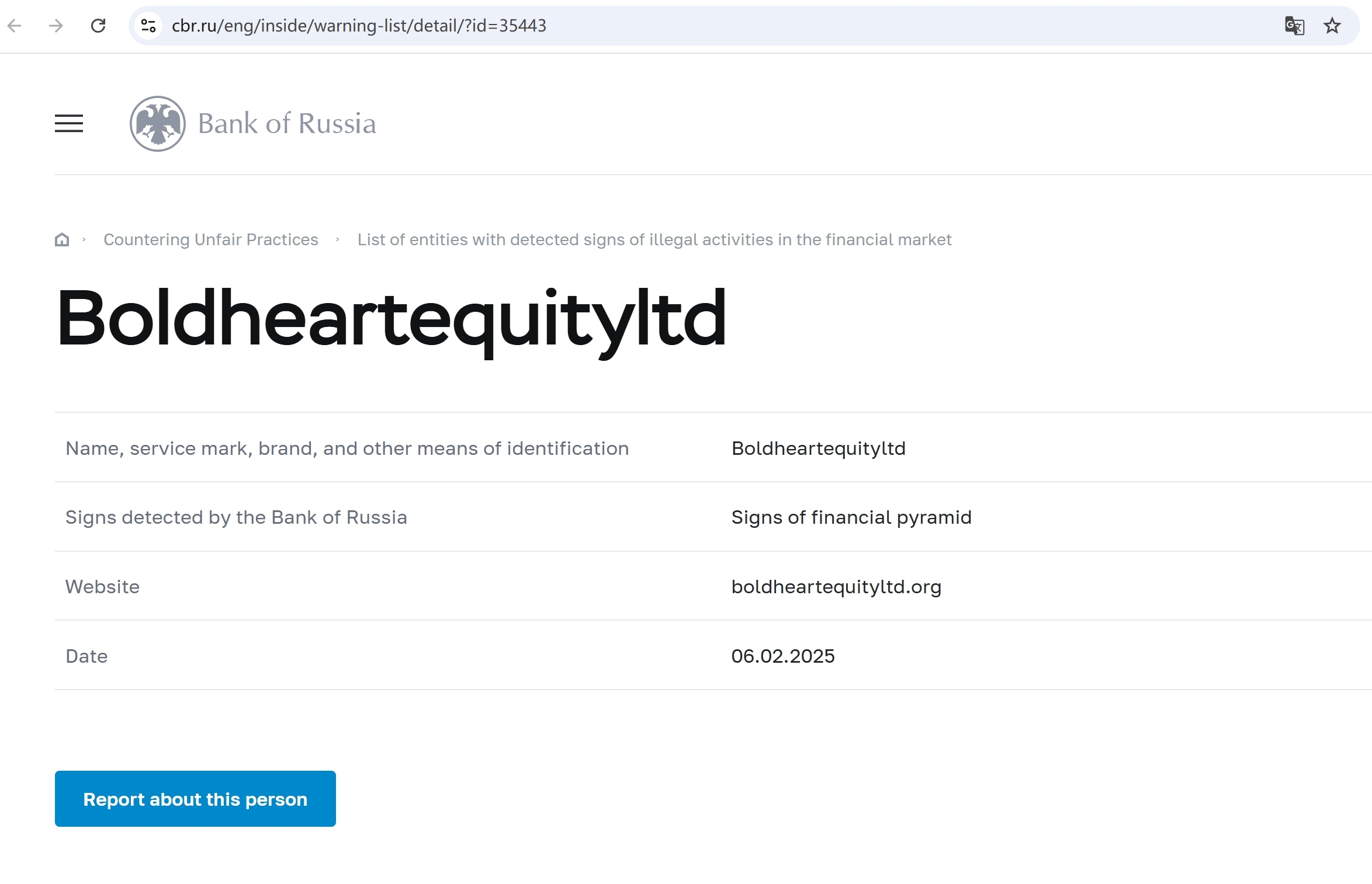 List of entities with detected signs of illegal activities in the financial market Boldheartequityltd