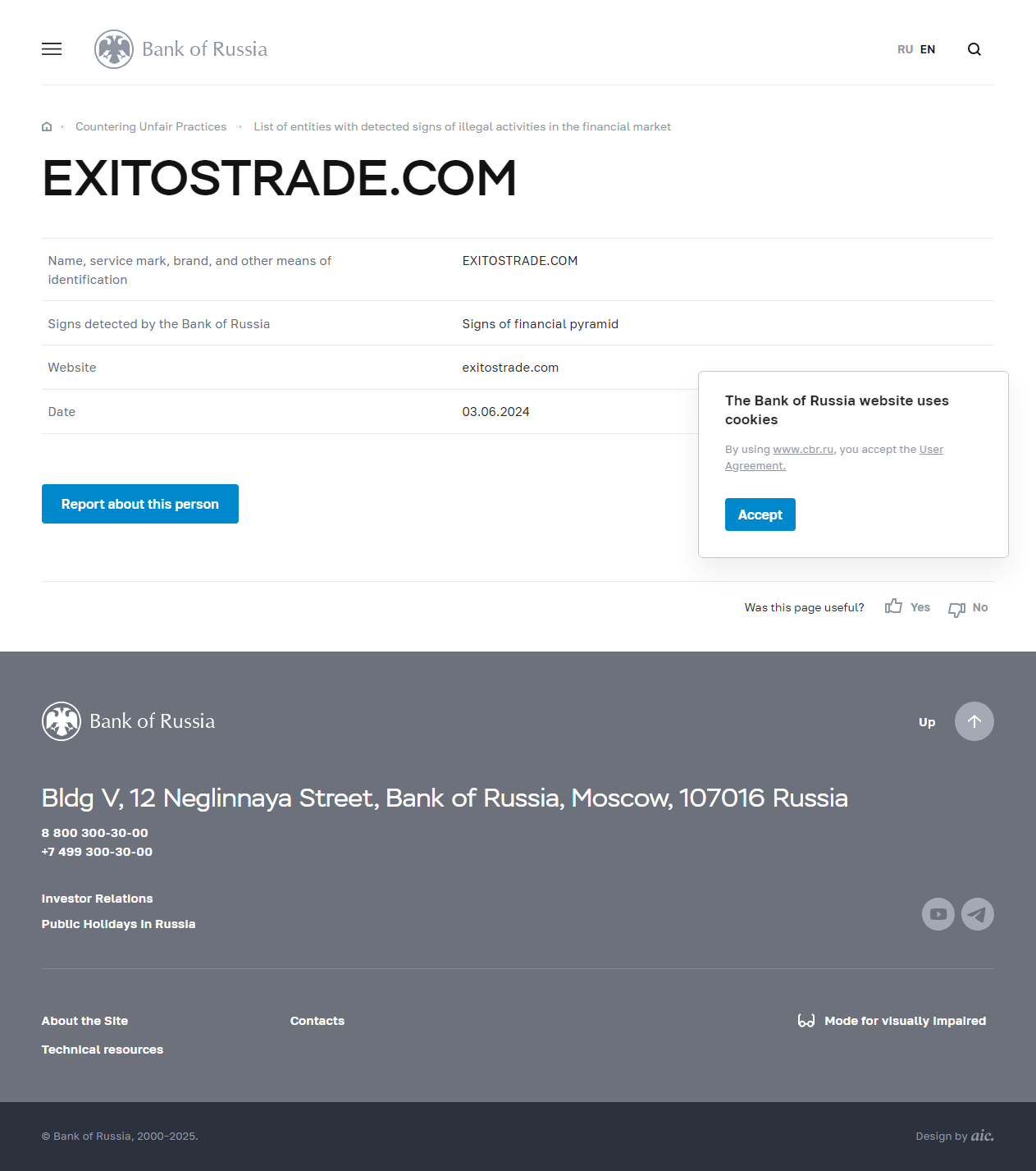 List of entities with detected signs of illegal activities in the financial market EXITOSTRADE.COM