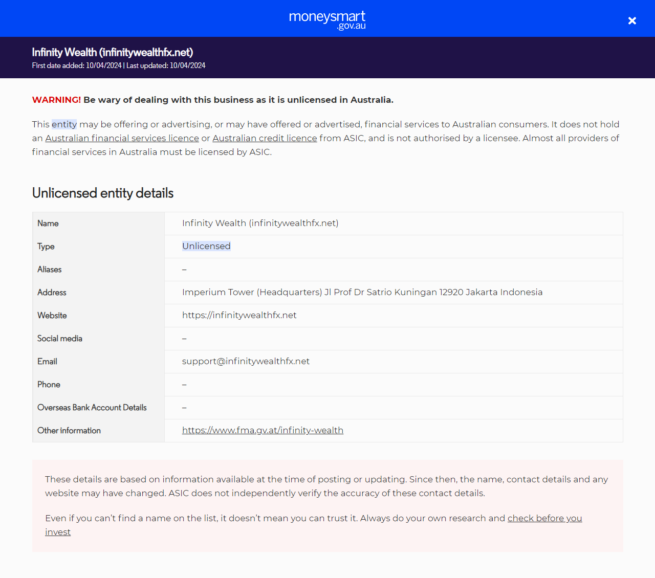 Other informationhttps://www.fma.gv.at/infinity-wealth