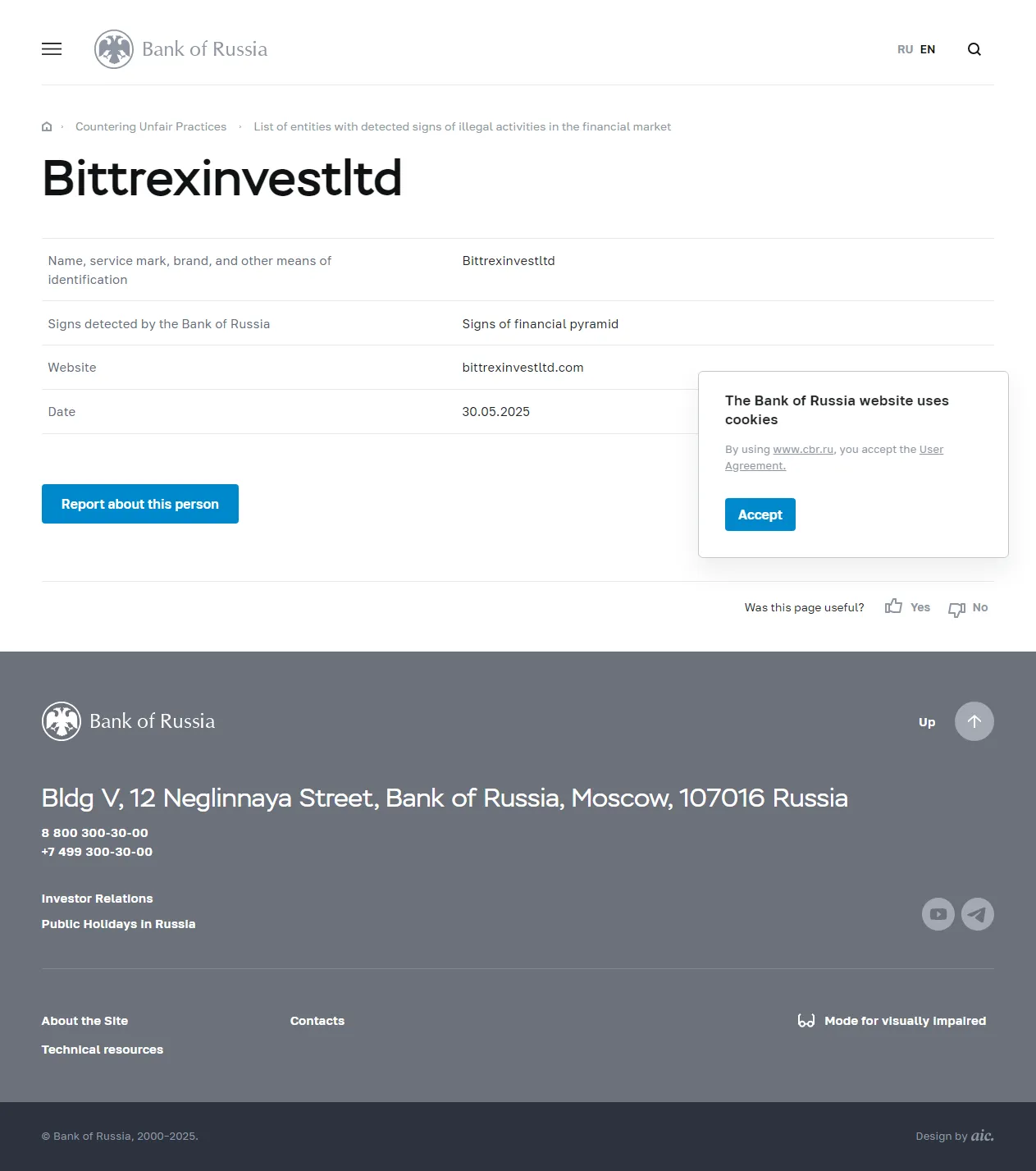 Name, service mark, brand, and other means of identification Bittrexinvestltd Signs detected by the Bank of Russia Signs of financial pyramid Website bittrexinvestltd.com Date 30.05.2025