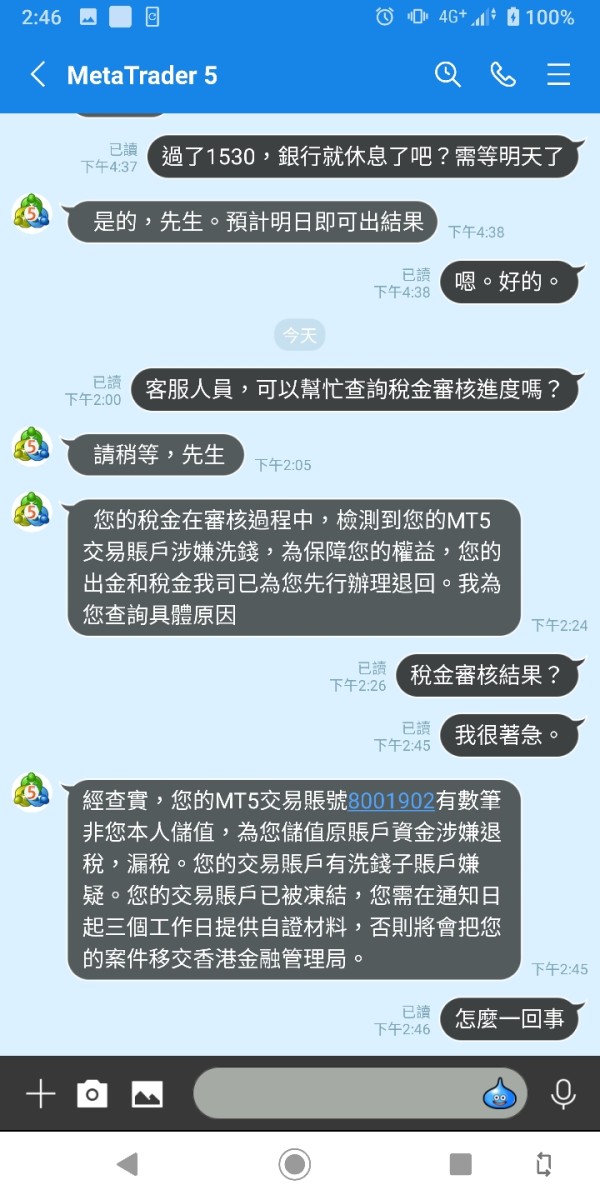 在九月中,交友網站認識一女以及引薦她的叔叔徐XX(因為尚未確認真偽,所以名字先保留)。鼓吹投資理財,一起投入資金,操作MT5,主要操作金融商品是ACEUSD。跟著她叔叔進場出場,獲利很可觀。直到我出金累計到3000美,就被通知要繳稅金,配合之後,又被通知資金流向有問題。後面女才說她資金有一筆是朋友資助,是黑錢,她正在報警處理。而我向客服討香港金管局公文,看起來不對勁。我寫信問香港金管局,金管局說是沒這回事。顯然是遇到詐騙了。我跟那女要她報警的報案單號來證明她不是詐騙一員,但遲遲不給,也漸漸不回應。我要去報警備案了。