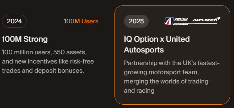 Iq option should be one of the biggest brokers in the world atm, because only in 2024 the total number of users was more than 100 million… Now they are in collaboration with my fav mclaren. All in all, the trust is over the roof. The trading conditions are decent too, especially the returns are high for forex pairs.