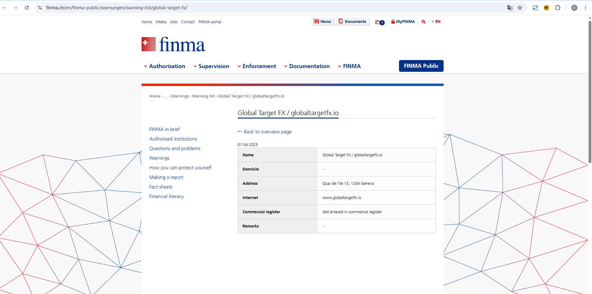 Lista de advertencia de empresas y personas no autorizadas Global Target FX / globaltargetfx.io.
