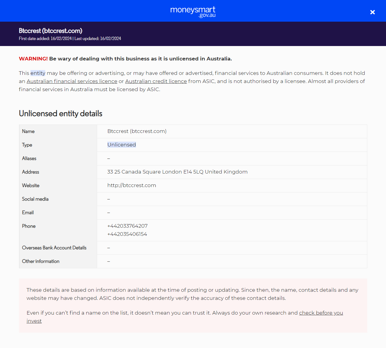 TipoOferta no autorizada de servicios financieros (incluyendo productos financieros) a personas en Australia sin licencia. No poseen una licencia de servicios financieros australianos (AFS) ni una licencia de crédito australiana de ASIC.