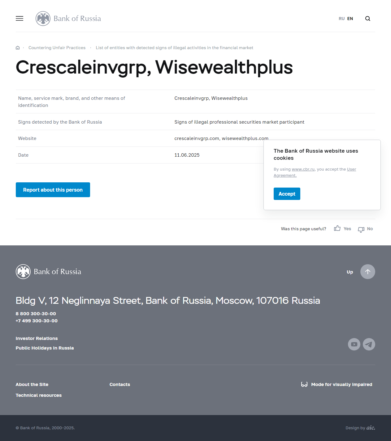 Lista de entidades con signos detectados de actividades ilegales en el mercado financiero Crescaleinvgrp, Wisewealthplus.
