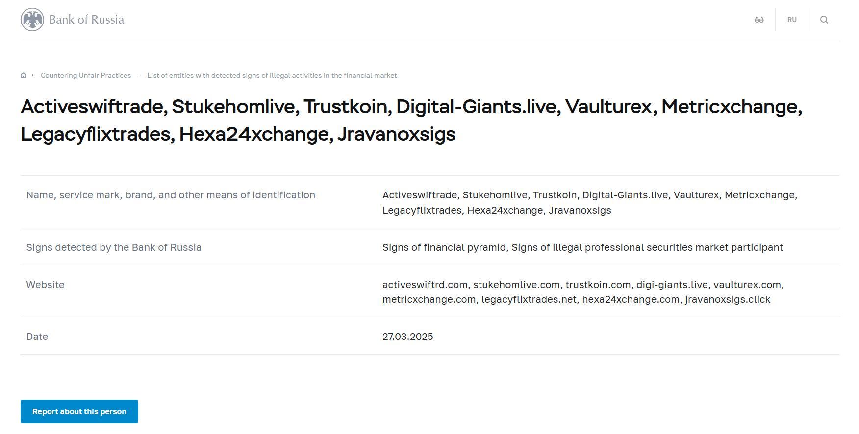 Nombre, marca de servicio, marca y otros medios de identificación Activeswiftrade, Stukehomlive, Trustkoin, Digital-Giants.live, Vaulturex, Metricxchange, Legacyflixtrades, Hexa24xchange Señales detectadas por el Banco de Rusia Señales de pirámide financiera, Señales de participante ilegal en el mercado profesional de valores Sitio web activeswiftrd.com, stukehomlive.com, trustkoin.com, digi-giants.live, vaulturex.com, metricxchange.com, legacyflixtrades.net, hexa24xchange.com Fecha 27.03.2025.