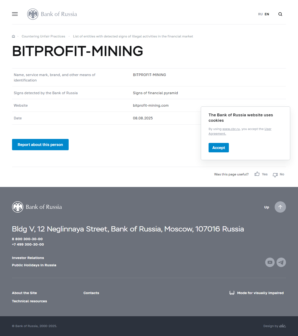 Nombre, marca de servicio, marca comercial y otros medios de identificación BITPROFIT-MINING Señales detectadas por el Banco de Rusia Señales de pirámide financiera Sitio web bitprofit-mining.com Fecha 08.08.2025.