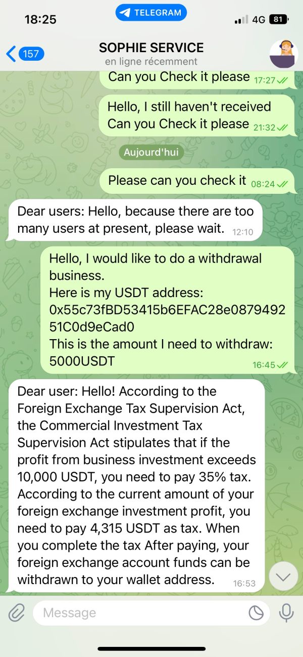 Hello, I want to withdraw 5000USDT from my broker SOPHIE CAPITAL FINANCIAL TRADING PTY LTD. The broker refused my withdrawal because of export taxes. This was never specified during my registration. Please take into account the attached documents and quickly unblock the situation. At this time I would like to withdraw my entire balance. For the taxes the broker can use it without any problem. Thank you for your help