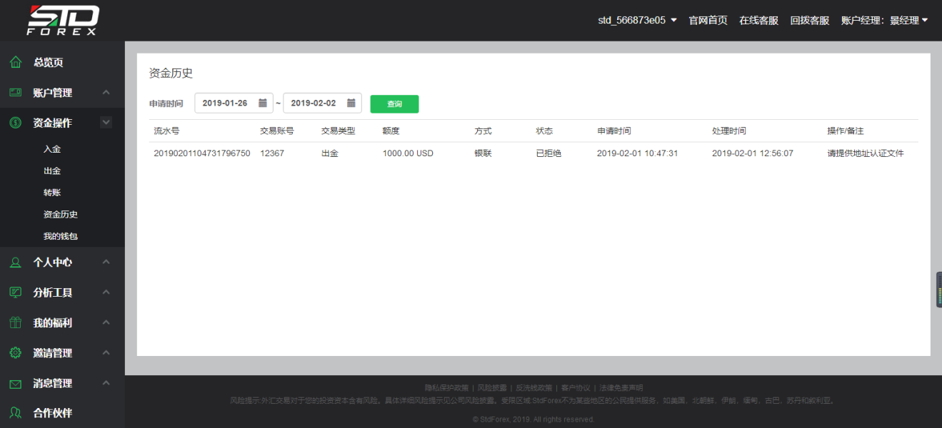 标准外汇申请出金被拒绝,理由是要提供地址认证文件