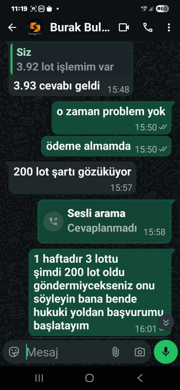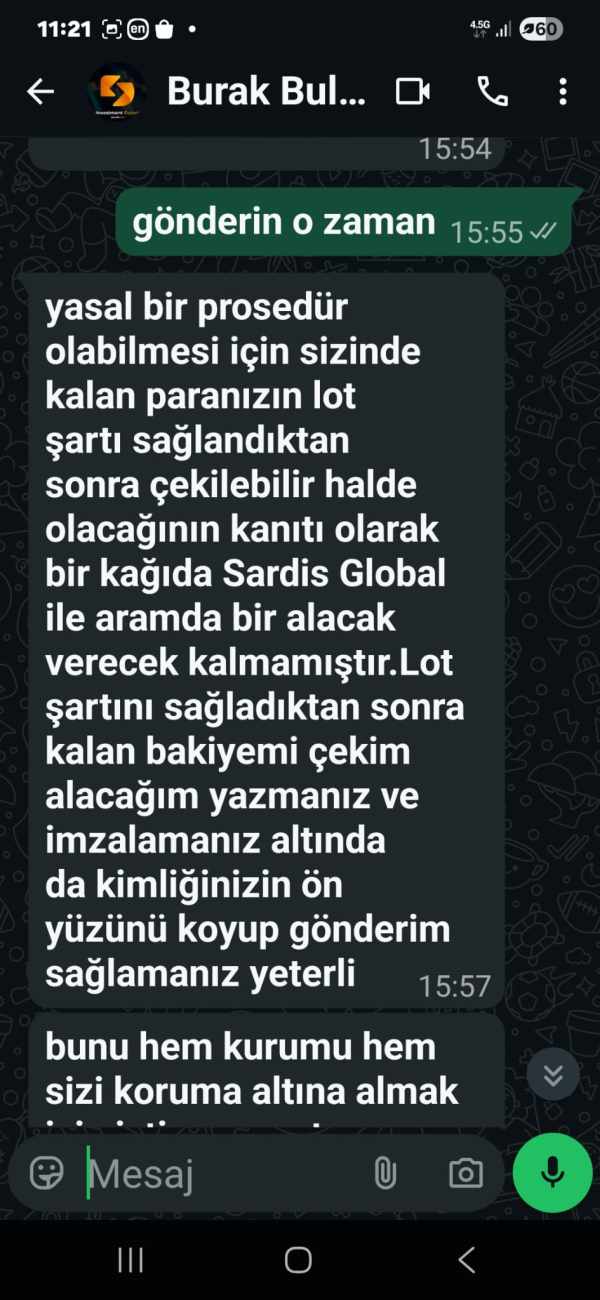 B hesap numarası ve Sardis Markets aracı kurumu ile işlem yapıyorum. Hesabımda şu anda yaklaşık 6.149 USD bakiye bulunmaktadır. Aracı kurum, "lot iadesi/iptali" gibi çeşitli bahaneler öne sürerek ve "fiyat bankası (META)" tarafından yapıldığını iddia ederek bakiyemi ödemekten kaçınıyor. 200 lot limiti talep ediyorlar. Bana herhangi bir somut işlem kaydı veya geçerli bir gerekçe sunmadılar. Durumun ayrıntıları, tüm yazışmalar ve hatta dolandırıcılar tarafından kullanıldığı görünen cümleler aşağıdaki gönderide gösterilmiştir. Platform: MetaTrader 5 Sunucu: SARDIS MARKETS Aracı Kurum: Sardis Markets Mevcut bakiye (yaklaşık): 6.149 USD İlgili ekran görüntüleri ve belgelerle birlikte aynı şikayeti size iletiyorum ve yasal haklarımı takip etmeden önce desteğinizi rica ediyorum. Bu şikayetin ardından hesabım şirket tarafından kapatıldı.