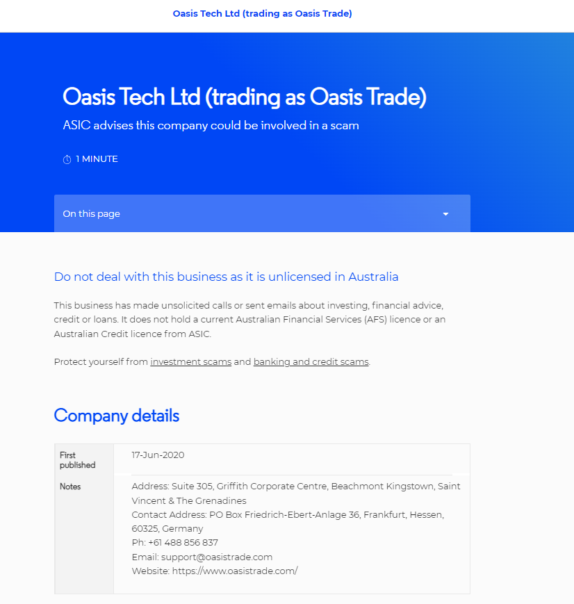 listahan ng babala sa mga investor Oasis Tech Ltd (nagtatrabaho bilang Oasis Trade) Binabalaan ng ASIC na ang kumpanyang ito ay maaaring kasangkot sa isang scam.