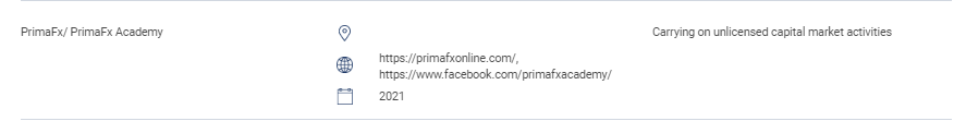 "Ang seksyong ito ay naglalaman ng listahan ng mga hindi awtorisadong website, mga produkto ng pamumuhunan, mga kumpanya at mga indibidwal. Kasama sa listahang ito ang: Mga taong nagsasagawa o nagpapahayag ng kanyang sarili bilang nagsasagawa ng mga sumusunod na kinokontrol na aktibidad nang walang lisensya mula sa SC: Pakikitungo sa mga securities; Pakikitungo sa mga derivatives; Pamamahala ng pondo; Pagpapayo sa pananalapi ng korporasyon; Payo sa pamumuhunan; Pagpaplano sa pananalapi; at Pagharap sa mga pribadong pamamaraan ng pagreretiro. Mga taong nagpapatakbo ng kinikilalang merkado nang walang awtorisasyon. Mga taong nag-iisyu o nag-aalok ng mga securities nang walang pag-apruba, awtorisasyon o pagkilala. Mga taong maling ginagamit ang logo ng SC at maling kumakatawan sa SC. " PrimaFx/ PrimaFx Academy https://primafxonline.com/, https://www.facebook.com/primafxacademy/ 2021 Pagsasagawa ng mga aktibidad sa hindi lisensyadong capital market