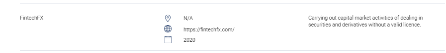 "Ang seksyong ito ay naglalaman ng listahan ng mga hindi awtorisadong website, mga produkto ng pamumuhunan, mga kumpanya at mga indibidwal. Kasama sa listahang ito ang: mga taong nagdadala o nagpapatunay sa kanyang sarili bilang nagsasagawa ng mga sumusunod na kinokontrol na aktibidad nang walang lisensya mula sa sc: pakikitungo sa mga securities; pakikitungo sa mga derivatives; pamamahala ng pondo; pagpapayo sa pananalapi ng korporasyon; payo sa pamumuhunan; pagpaplano sa pananalapi; at pakikitungo sa mga pribadong pamamaraan ng pagreretiro. mga taong nagpapatakbo ng isang kinikilalang merkado nang walang awtorisasyon. mga taong nag-isyu o nag-aalok ng mga securities nang walang pag-apruba, awtorisasyon o pagkilala. mga taong maling ginagamit ang logo ng sc at maling pagkatawan sa sc. " FintechFX n/a https:// FintechFX .com/ 2020 na nagsasagawa ng mga aktibidad sa capital market ng pag-deal sa mga securities at derivatives nang walang valid na lisensya.