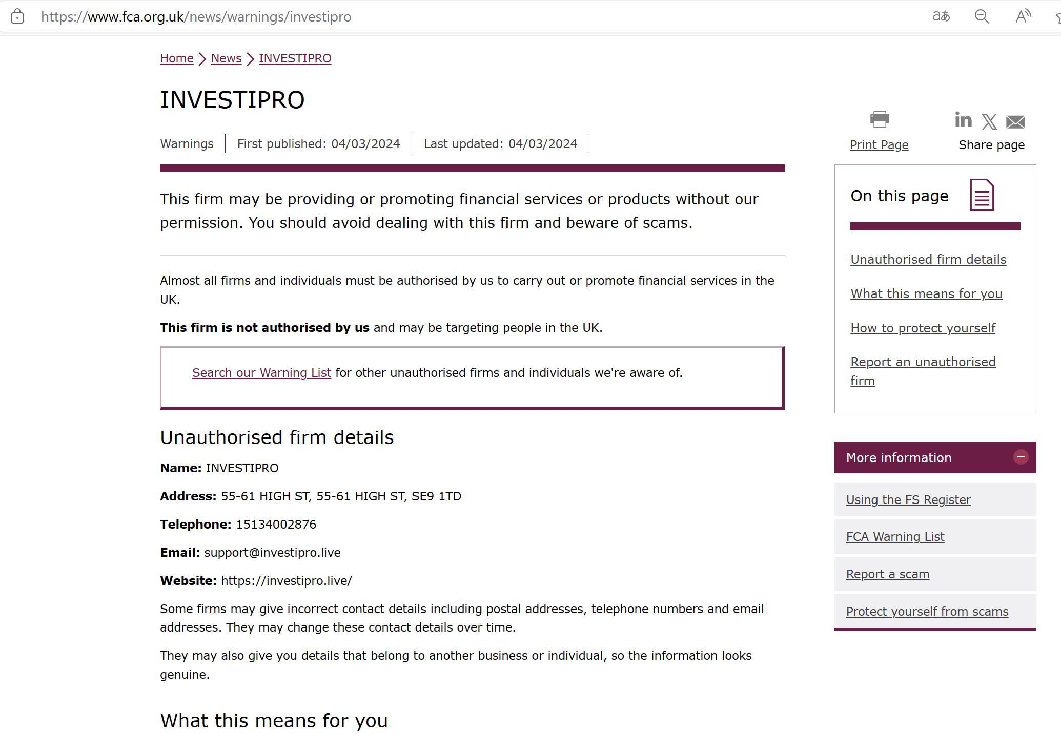 Listahan ng Babala ng FCA sa mga hindi awtorisadong kumpanya INVESTIPRO.