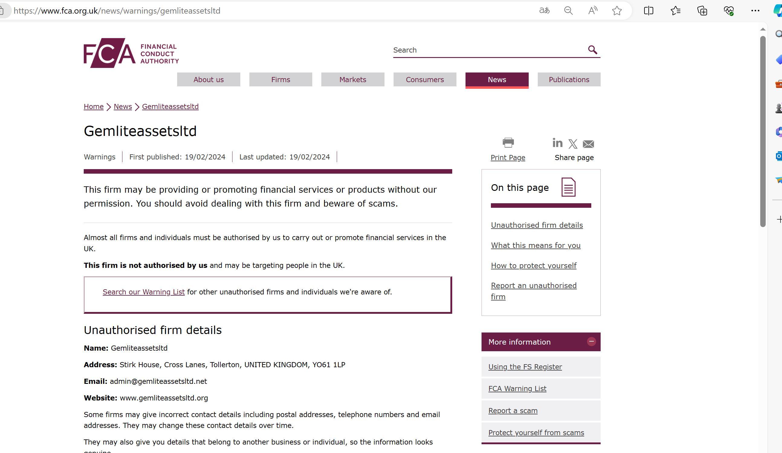 Listahan ng Babala ng FCA ng mga hindi awtorisadong kumpanya Gemliteassetsltd.
