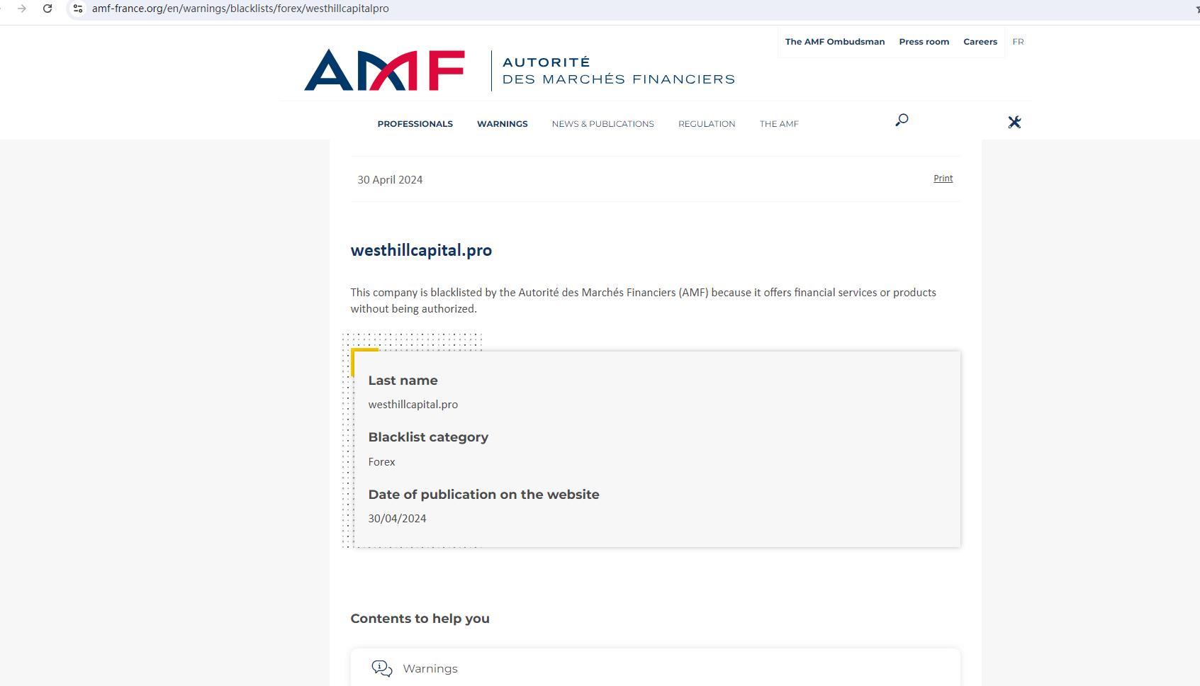 - Dahilan ng parusawesthillcapital.pro Ang kumpanyang ito ay naka-blacklist ng Autorité des Marchés Financiers (AMF) dahil nag-aalok ito ng mga serbisyo o produkto sa pananalapi nang hindi pinapahintulutan.