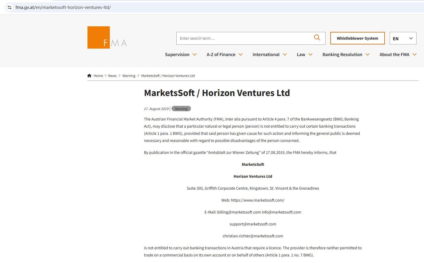 MarketsSoft/ horizon ventures ltd petsa ng paglabas:17. Agosto 2019 | mga kategorya:babala sa austrian financial market authority (fma), inter alia alinsunod sa artikulo 4 para. 7 ng bankwesengesetz (bwg; banking act), ay maaaring ibunyag na ang isang partikular na natural o legal na tao (tao) ay hindi karapat-dapat na magsagawa ng ilang partikular na transaksyon sa pagbabangko (artikulo 1 para. 1 bwg), sa kondisyon na ang nasabing tao ay nagbigay ng dahilan para sa naturang aksyon at ang pagpapaalam sa pangkalahatang publiko ay itinuturing na kinakailangan at makatwiran patungkol sa mga posibleng disadvantage ng taong kinauukulan. sa pamamagitan ng paglalathala sa opisyal na pahayagan na "amtsblatt zur wiener zeitung" ng 17.08.2019, ipinapaalam ng fma, na MarketsSoft horizon ventures ltd suite 305, griffith corporate center, kingstown, st. vincent & the grenadines web: https://www. MarketsSoft .com/ e-mail: billing@ MarketsSoft .com info@ MarketsSoft .com support@ MarketsSoft .com christian.richter@ MarketsSoft Ang .com ay walang karapatan na magsagawa ng mga transaksyon sa pagbabangko sa austria na nangangailangan ng lisensya. samakatuwid ang provider ay hindi pinahihintulutan na makipagkalakalan sa isang komersyal na batayan sa sarili nitong account o sa ngalan ng iba (artikulo 1 para. 1 no. 7 bwg).