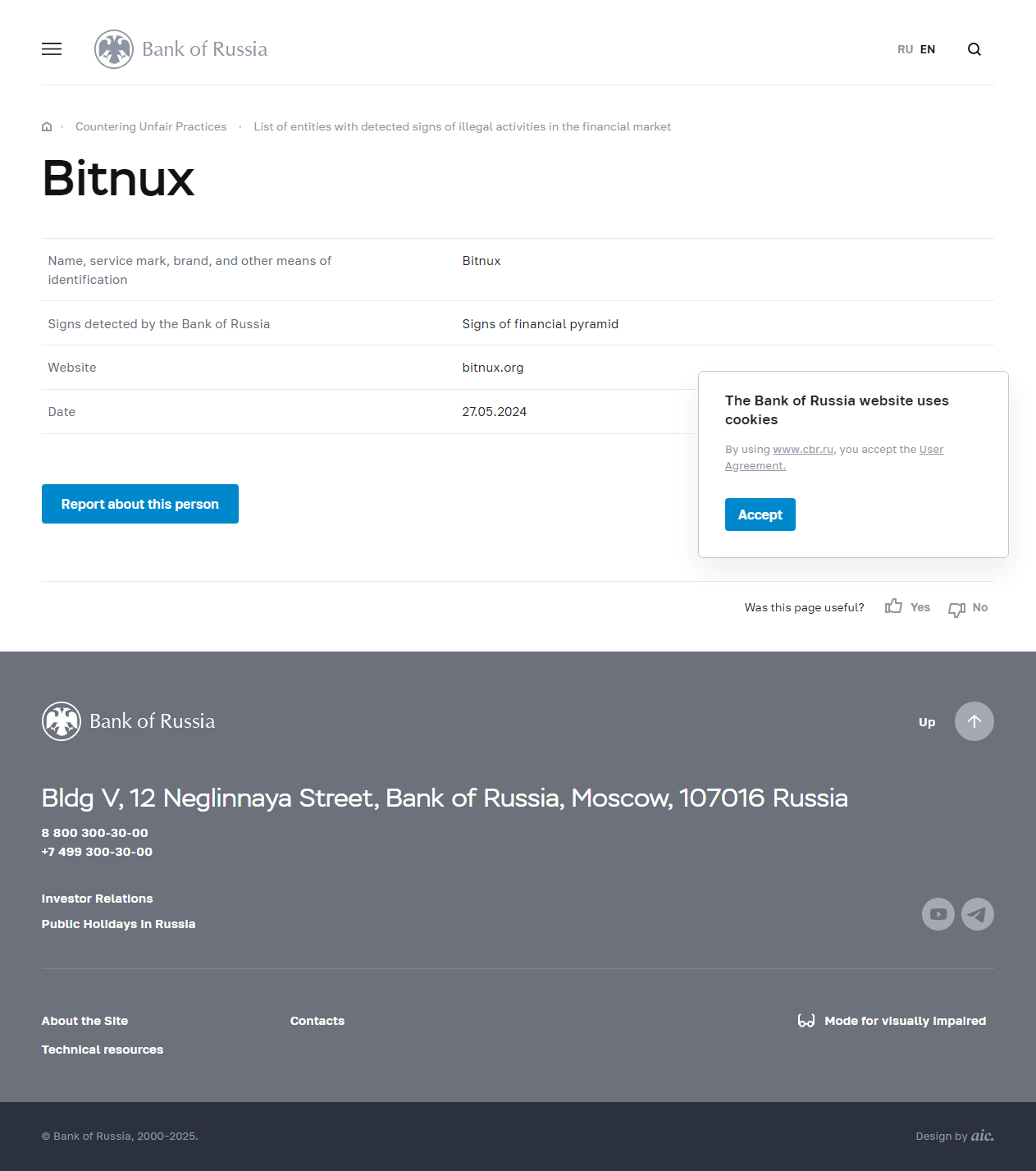 Listahan ng mga entidad na may natukoy na palatandaan ng ilegal na gawain sa pamilihang pinansyal na Bitnux.