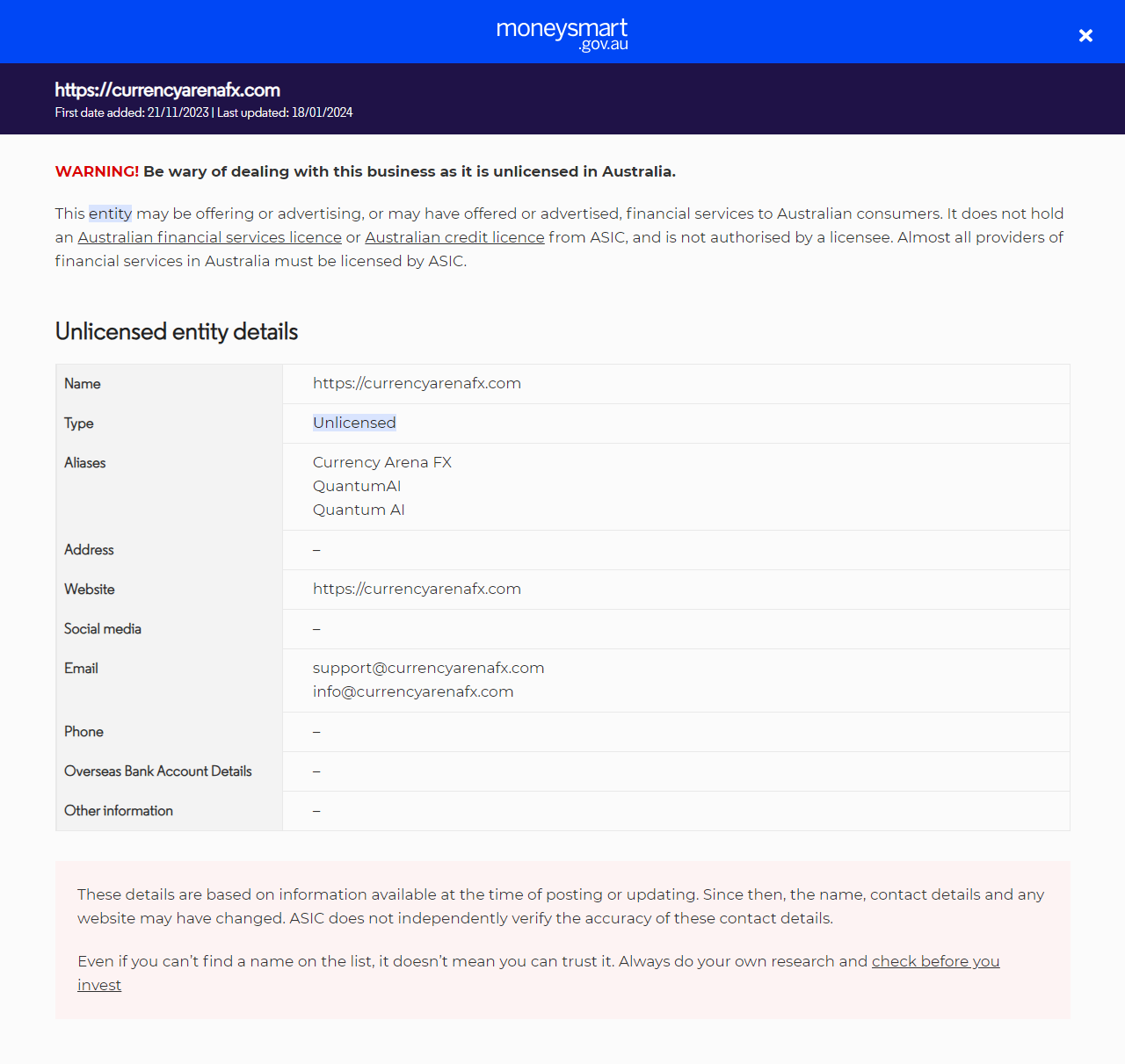 Hindi lisensyadong pagbibigay ng mga serbisyong pampinansyal (kabilang ang mga produkto sa pananalapi) sa mga tao sa Australia nang walang lisensya. Wala silang Australian financial services (AFS) licence o Australian credit licence mula sa ASIC.