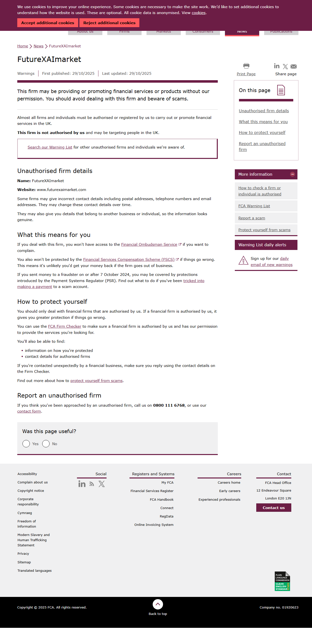Listahan ng Babala ng FCA ng mga hindi awtorisadong kumpanya FutureXAImarket.