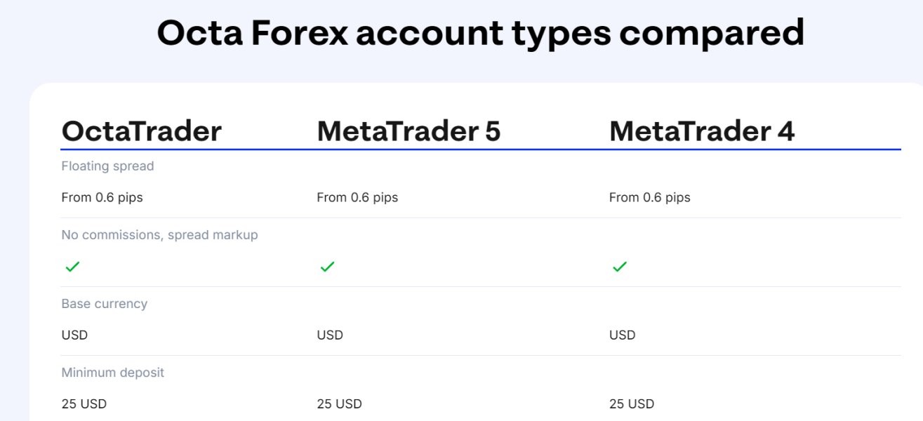 They made things simpler than any other broker i have traded in the past regarding the process of choosing an acc type,. Regarding the trading codnitons, all account are pretty much the same. What you need to choose is your favorit trading engine. I chose the octatrader.. Initially it took me some time to understand the app, but it’s not hard at all. The only limit it has is the max open positions - it’s 50 lots, which is way more than intend to trade, and no EAs.