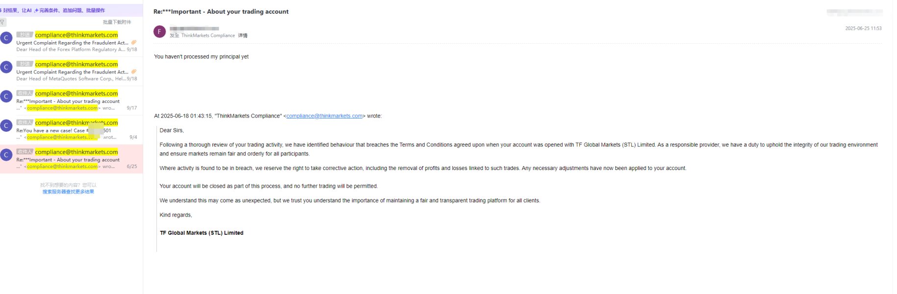 今年4~5月份入金了30000USD,在2025年6月10日,由于单边行情,我的账户产生了收益,随之不久后我收到一封来自thinkmarkets平台的邮件,声称我参与了非法活动,并通知我他们将调整账户余额并关闭我的账户!他们不仅仅扣除了我全部利润43,685USD,我尝试出金本金30000USD三个月以来一直不予处理!三个月以来我多次联系智汇平台索要我的本金和利润,该平台都是置之不理,没有任何反应!我甚至投诉了监管,他们是黑平台,根本不会被合法监管,大家千万不要来这个平台!!!!