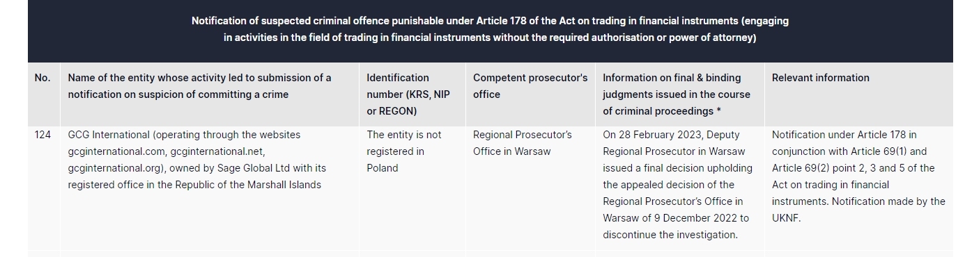 GCG International(opérant via les sites Web gcginternational.com, gcginternational.net, gcginternational.org), propriété de Sage Global LTD ayant son siège social en république des îles marshall, l'entité n'est pas enregistrée auprès du parquet régional de Pologne à Varsovie le 28 février 2023, le procureur régional adjoint de Varsovie a rendu une décision finale confirmant la décision en appel du parquet régional de Varsovie du 9 décembre 2022 pour mettre un terme à l’enquête. notification selon l'article 178 en liaison avec l'article 69, paragraphe 1, et l'article 69, paragraphe 2, points 2, 3 et 5, de la loi sur le commerce d'instruments financiers. notification faite par l'uknf.
