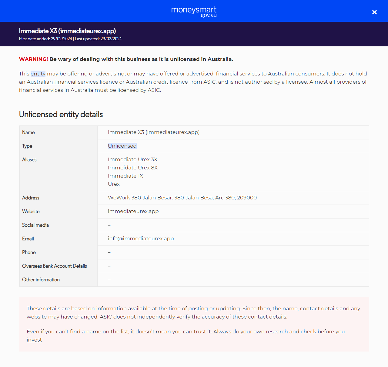 TypePrestation de services financiers (y compris les produits financiers) à des personnes en Australie sans licence. Ils ne détiennent pas de licence de services financiers australiens (AFS) ou de licence de crédit australienne de l'ASIC.