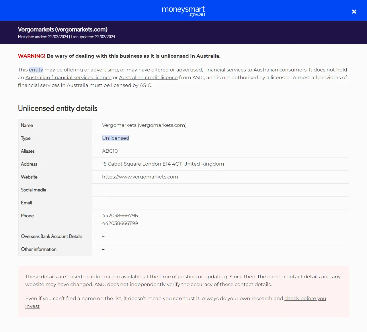 TypeOffre de services financiers (y compris des produits financiers) à des personnes en Australie sans licence. Ils ne détiennent pas de licence de services financiers australiens (AFS) ou de licence de crédit australienne de l'ASIC.