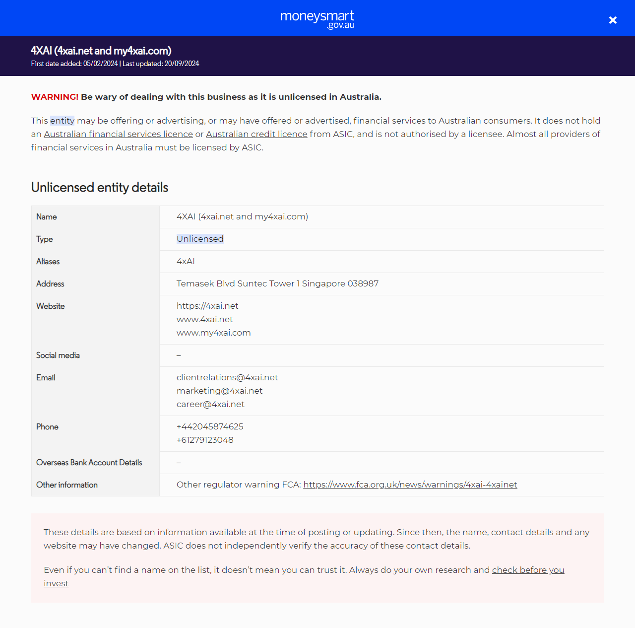 Autres informationsAutre avertissement régulateur FCA:https://www.fca.org.uk/news/warnings/4xai-4xainet.