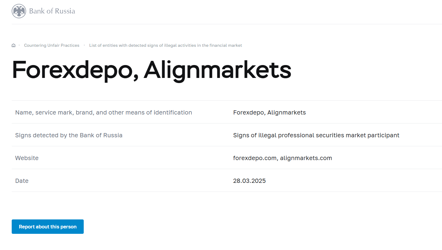 Nom, marque de service, marque et autres moyens d'identification Forexdepo Signes détectés par la Banque de Russie Signes de participant illégal au marché professionnel des valeurs mobilières Site web forexdepo.com Date 28.03.2025.
