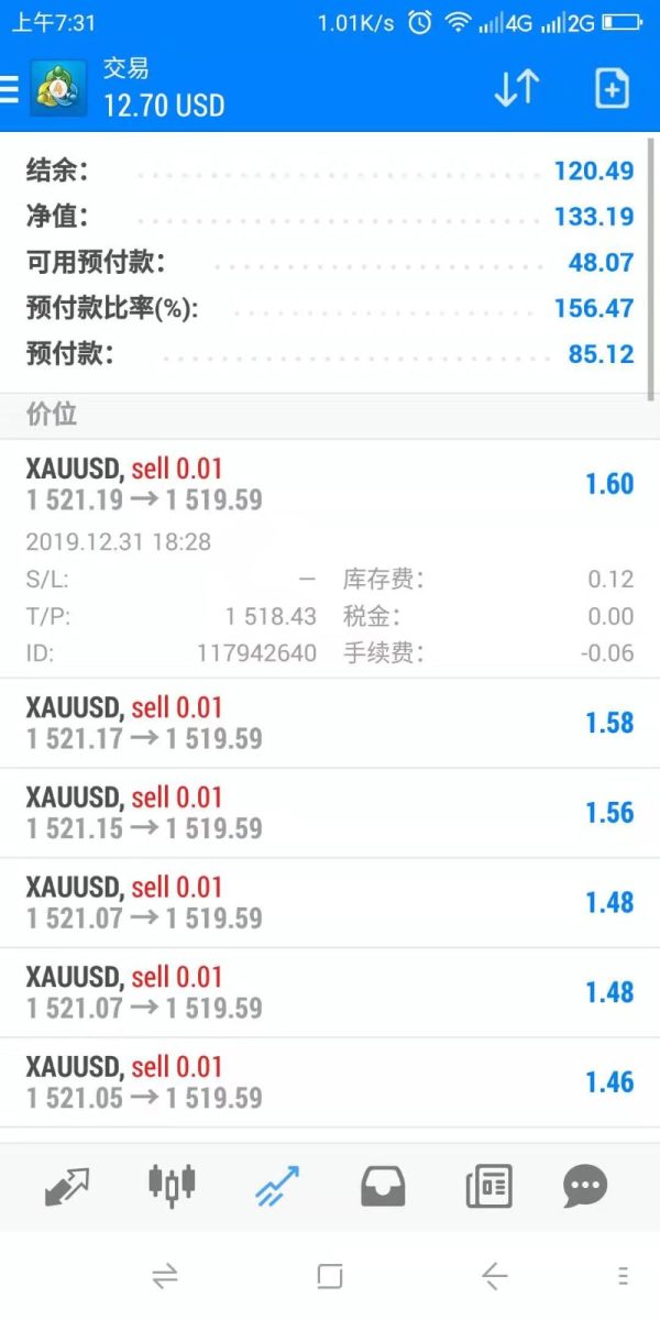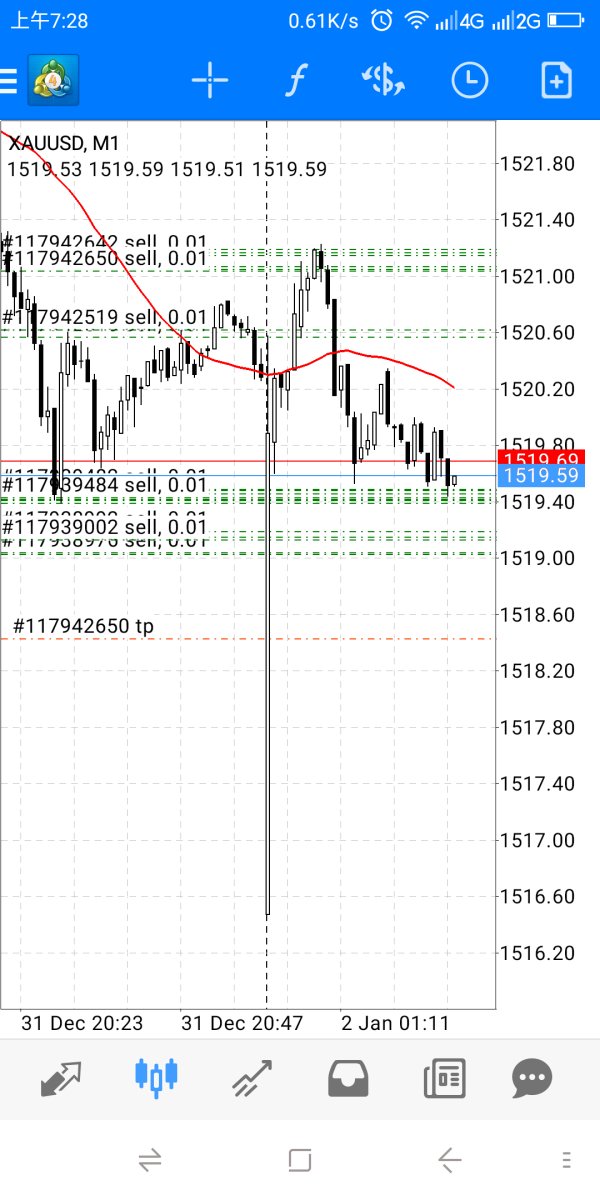 2019年12月31号的单子,止盈设1518.43,在2020年1月2号开盘,最低价是1516.50,居然没成交。